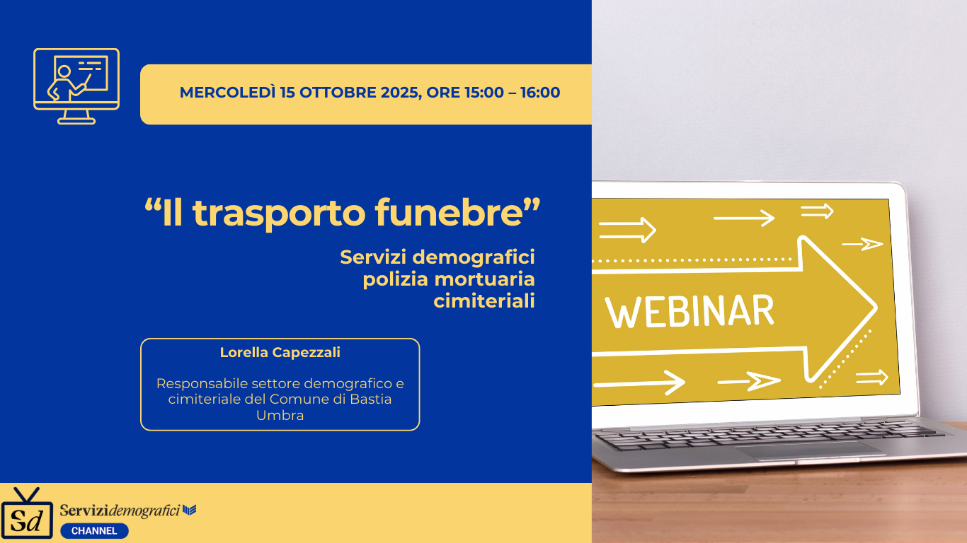 Mercoledì 15 ottobre 2025 dalle ore 15.00 alle 16.00 si terrà il nuovo incontro on line con l’esperto in diretta di Servizi Demografici Channel a cura di Lorella Capezzali dal titolo: Il trasporto funebre.
