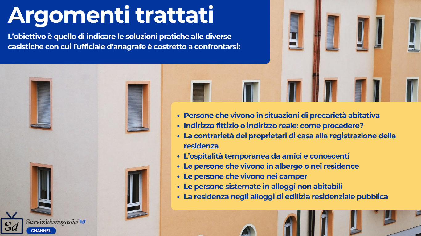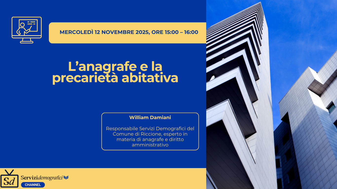 Mercoledì 12 novembre 2025 dalle ore 15.0 alle 16.00 si terrà il nuovo incontro on line con l’esperto in diretta di Servizi Demografici Channel a cura di William Damiani dal titolo: L’anagrafe e la precarietà abitativa.